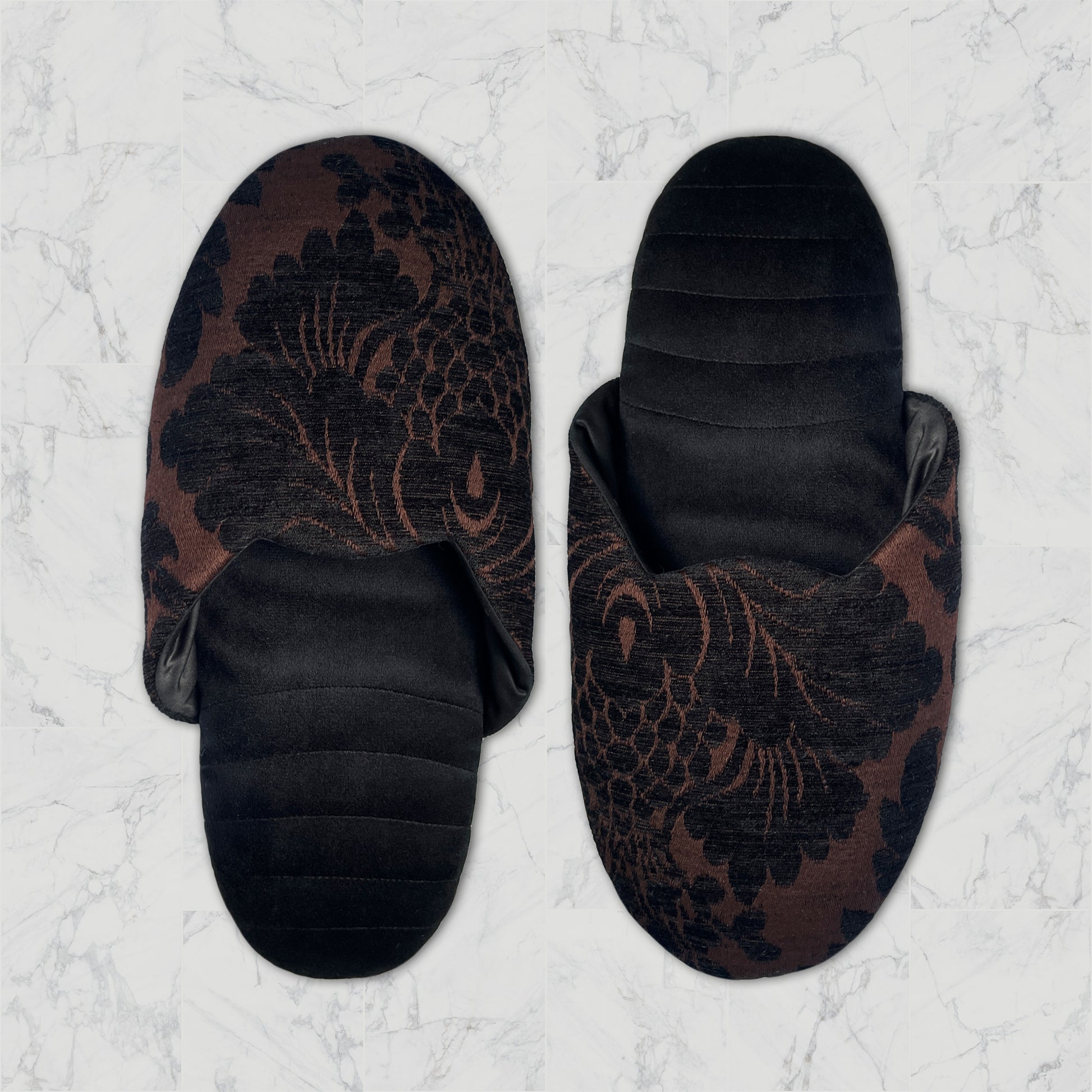 Slip into these luxurious, handcrafted slippers, adorned with a rich brocade fabric featuring an intricate brown-black floral pattern. With a plush lining and soft sole, they’re designed for both style and comfort, making each step feel refined. Perfect for adding a touch of old-world charm to your everyday moments at home.